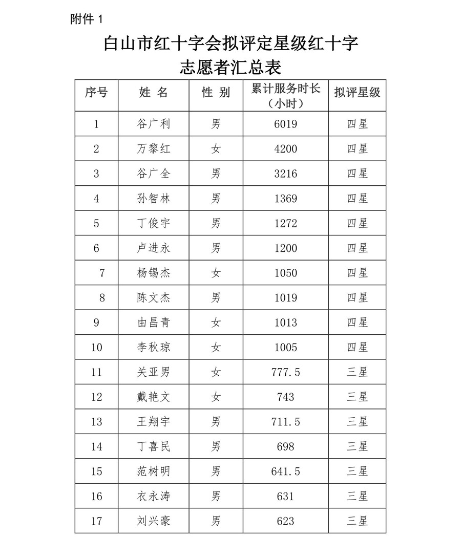 附件:1.白山市红十字会拟评定星级红十字志愿者汇总表
